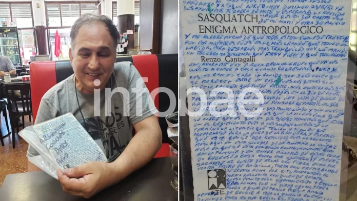 Son ocho páginas escritas de anverso y reverso en birome azul, en mayúsculas, a veces en diagonal, con la letra por momentos grande y otros chiquita, como queriendo ganarle espacio al blanco de las primeras hojas del libro “Sasquatch, enigma antropológico”, de Renzo Cantagalli, editado por A.T.E. en el año 1979. “Beto” aprovechó cada milímetro de la portada, anteportada, presentación e índice de la obra. “Como podés ver, hay muchas faltas de ortografía. Hay palabras que ni yo entiendo ahora”, le cuenta risueño Altieri a Infobae.