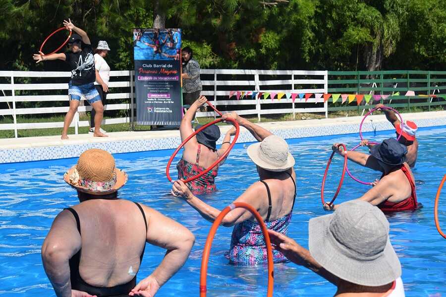 Al predio ubicado en la ruta nacional 16 (inmediaciones al ingreso a Puerto Tirol) llegaron integrantes de los clubes “Nueva Vida”, “Juntos para ser felices” y “Abuelos Santa Inés” para formar parte de las clases de aqua gym y otras actividades recreativas.