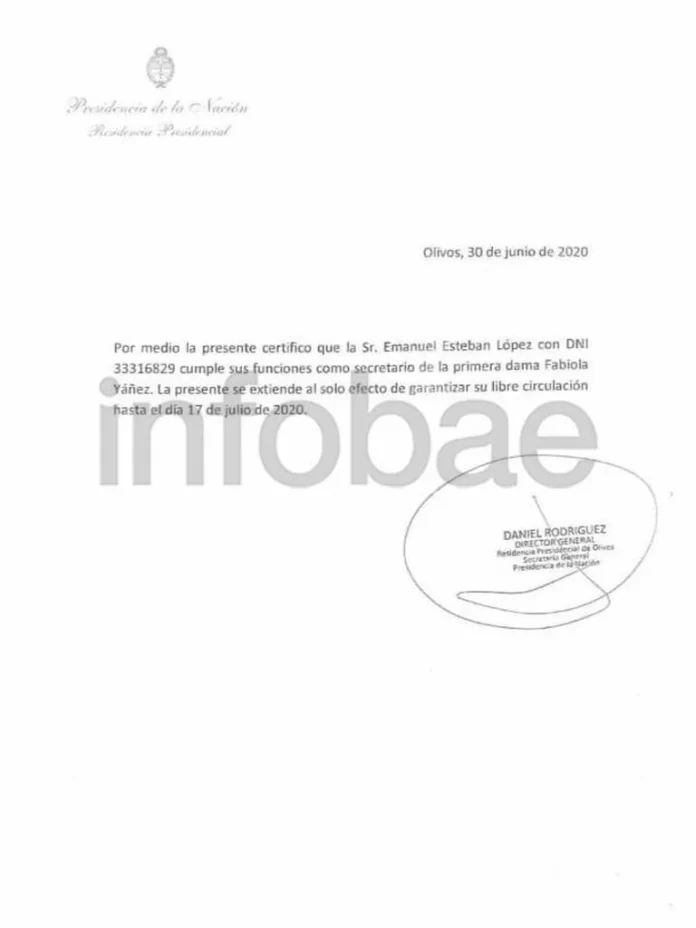 “Certifico que la Sr. Emanuel Esteban López con DNI 33316829 cumple sus funciones como secretario de la primera dama Fabiola Yañez. La presente se extiende al solo efecto de garantizar su libre circulación hasta el día 17 de julio de 2020”. La leyenda y el formato se repetía en todos los permisos: un sello de Presidencia de la Nación, apenas un párrafo que “habilitaba” a circular y la firma del intendente de la quinta de Olivos, Daniel Rodríguez, uno de los mejores amigos del Presidente. Tal como había revelado Infobae en octubre pasado, al menos tres de los participantes de la Fiesta de Olivos circularon con ese papel, aunque no tenía ninguna validez legal. De hecho, los certificados se fueron renovando durante varios meses. Es más, según pudo saber Infobae, tuvieron que exhibirlos en varios controles policiales. Nunca despertaron sospechas.