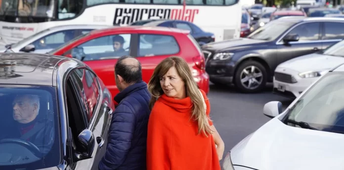 La portavoz de la Presidencia quedó atascada en medio de un piquete y debió que caminar entre los autos para evitarlo.