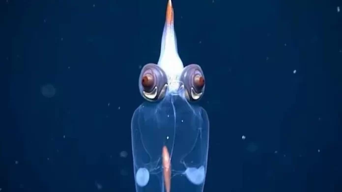 Un calamar transparente de aspecto alienígena con demoníacos ojos rojos fue filmado en las profundas aguas de la costa de Alaska.