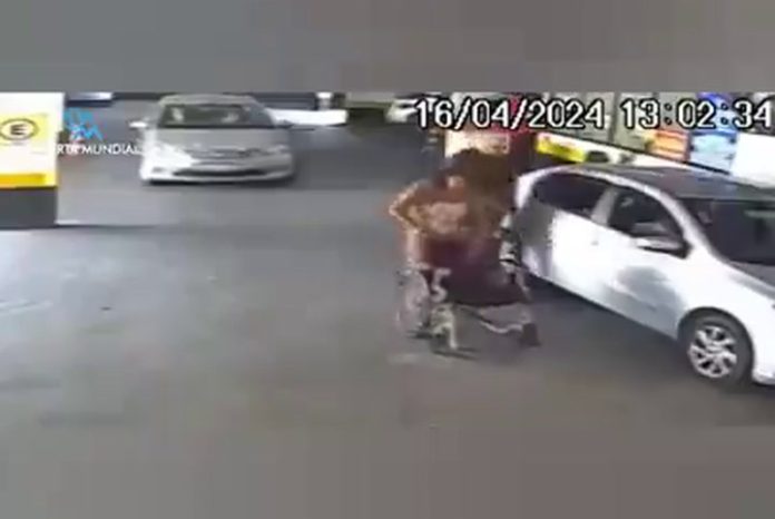 En la grabación se la puede ver buscando una silla de ruedas en el estacionamiento de un centro comercial para poder trasladar el cadáver.