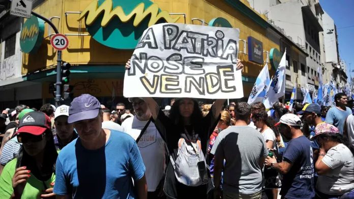 Taxistas, camioneros, trabajadores de la cultura, periodistas, enfermeros, aceiteros, estibadores, empleados estatales, desocupados y muchos jubilados colmaron el centro porteño ahogados en dos gritos esenciales: “La Patria no se vende” y “El que no salta votó a Milei”.