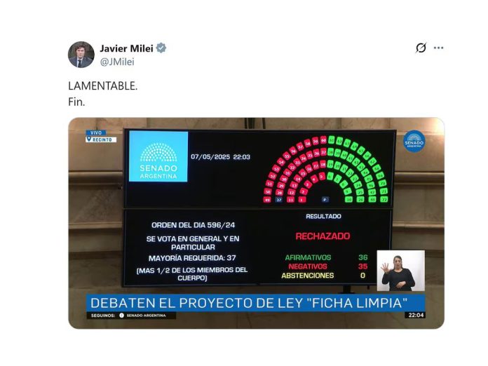 El presidente Javier Milei expresó su disconformidad con el desempeño de los senadores nacionales en el tratamiento de la Ley de Ficha Limpia, que fue rechazada este miércoles 7 de mayo. “Lamentable. Fin”, sintetizó el jefe de Estado luego del resultado de la votación.