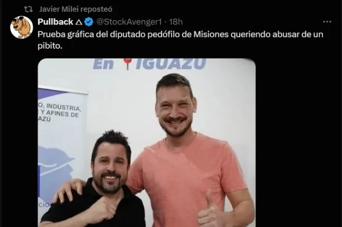 “Prueba gráfica del diputado pedófilo de Misiones queriendo abusar de un pibito”, dice el texto que acompaña la foto del legislador Kiczka junto a Tetaz, publicada por un usuario, y reposteada por el Presidente, en un intento despegarse del acusado y asociarlo a sus aliados.