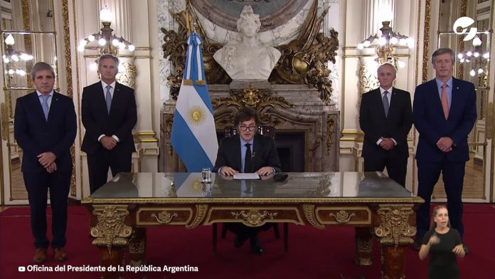 La puesta en escena fue calculada: al igual que en el mensaje emitido en diciembre para anunciar el mega DNU, el jefe de Estado utilizó el Salón Blanco donde estuvo acompañado por un grupo de colaboradores. Esta vez formaron parte de la emisión el ministro de Economía, Luis “Toto” Caputo, el secretario de Finanzas, Pablo Quirno, el presidente del Banco Central, Santiago Bausili y su vice, Vladimir Werning.