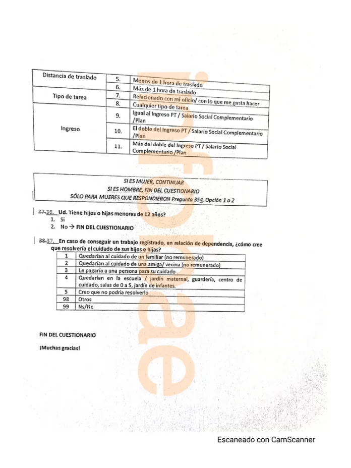 Son casi 40 items que apuntan a conocer, no solo la realidad social que vive cada uno de los casi 1.300.000 beneficiaros, sino también a qué organización social pertenecen: es decir si es oficialista u opositora; si están dispuestos a dejar de recibir el plan a cambio de un “trabajo formal, registrado, en relación de dependencia”; si la contraprestación laboral para cobrar el plan la hace como “integrante de una organización comunitaria/social”, como “integrante de un pequeño emprendimiento”, o “como trabajador municipal”; y si desarrollan otra actividad y que remuneración perciben. Entre otras preguntas, el amplio cuestionario está destinado a saber si las personas “conocen a qué Unidad de Gestión (UG) y/u organización pertenece” y en este caso debe nombrar si trabajan en una cooperativa, por ejemplo, a cargo de los oficialistas Movimiento Evita y Somos Barrios de Pie, o de organizaciones enfrentadas al gobierno del Frente de Todos, como el Polo Obrero o el Movimiento Teresa Vive-MTS, que integran la Unidad Piquetera.