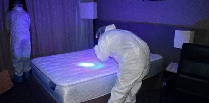 Además, se encontraron fluidos biológicos en una frazada de microfibra, así como rastros de sangre y saliva en diversos puntos de la habitación, incluyendo la alfombra cerca del frigobar y el lateral izquierdo de la mesa de luz.