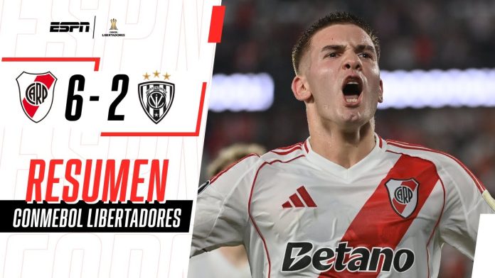 River Plate vapuleó 6-2 a Independiente del Valle y sacó pasaje a los octavos de final de la Copa Libertadores, a falta de una fecha para el final de la fase de grupos. Driussi, Zárate (en contra), Mastantuono, Meza, Borja y Lanzini convirtieron para el Millonario, Hoyos y Spinelli fueron los autores de los goles del equipo ecuatoriano. De esta manera, los dirigidos por Marcelo Gallardo se aseguraron el liderazgo en el Grupo B y suman con 11 puntos, seguido por Universitario (el próximo rival) con 7, Independiente del Valle (5) y Barcelona (4). Ahora apuntarán su mira en el partido del próximo martes ante Platense, de nuevo en el estadio Monumental, por los cuartos de final del Torneo Apertura.