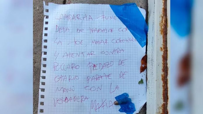 La amenaza estaba dirigida a “Lamparita” Funes, hermano de Alan, uno de los principales socios del narco Estaban Alvarado, y menciona al gobernador Maximiliano Pullaro. El papel fue encontrado por trabajadores municipales