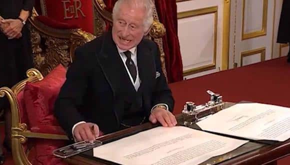 Durante la firma de la Proclamación de Adhesión, que marca su ascenso oficial al trono británico, se pudo ver cómo un ofuscado Carlos pide a un asistente en dos ocasiones que retire la bandeja de bolígrafos de su escritorio antes de seguir escribiendo.