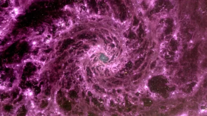 NGC 628 se parece mucho a la Vía Láctea si pudiera ser fotografiada desde arriba. Las anteriores imágenes ya habían revelado esta estructura con anterioridad. Sin embargo, el Webb revela elementos ocultos, como una composición química única de las nubes de polvo, que se forman principalmente de moléculas grandes llamadas hidrocarburos aromáticos policíclicos y que le dan ese tono violeta.